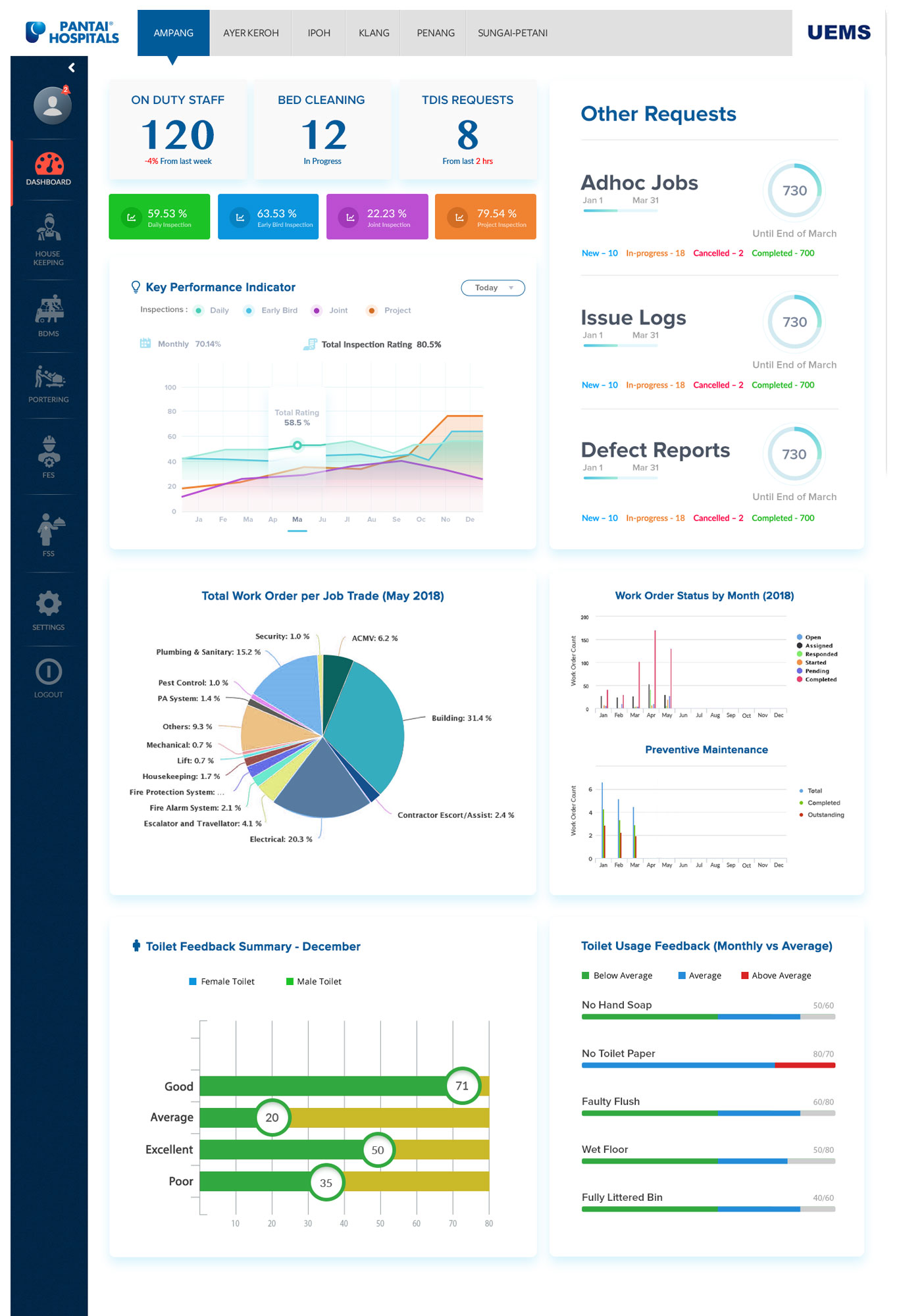 This dashboard was built to help facility teams in Pantai Hospitals monitor real-time operations — including maintenance, cleanliness, toilet feedback, and staffing levels.